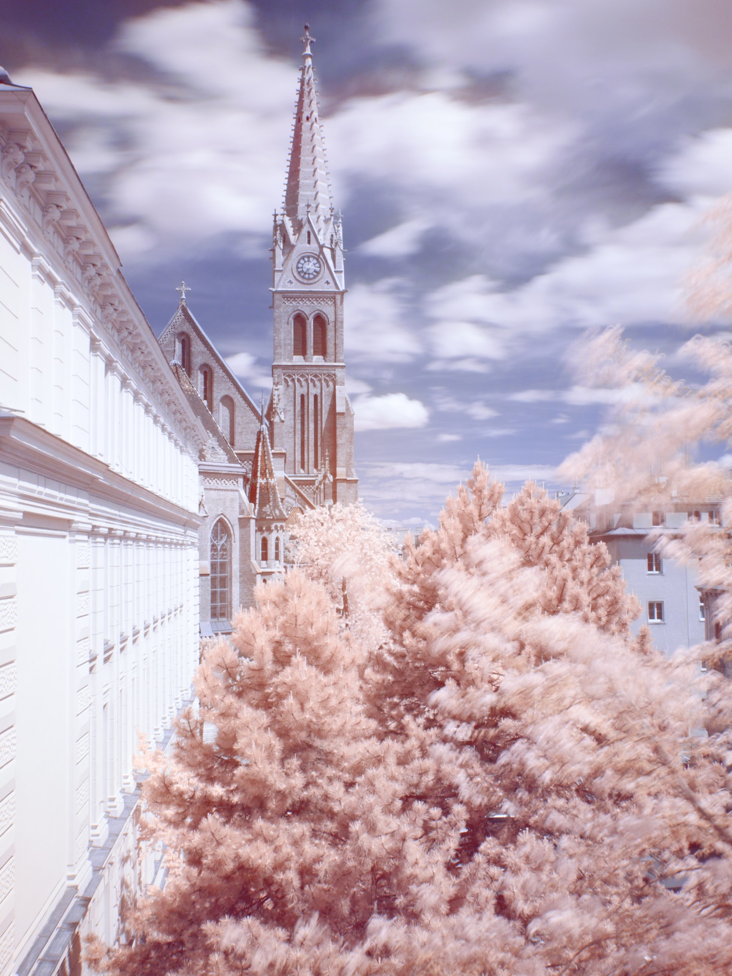 First roll, trying to get my head around infrared, in anticipation of a workshop we will hold at the metalab next month. Shot with an Olympus OM 2, Hoya R72 filter, 28mm lens. I tried metering through the lens/filter and set the camera to ISO 100. The Film came out very thin, I’ll probably will rate it ISO 25 next time. Still, there is enough on there to post some pictures. Actually 6 of them (making this a larger post by recent standards), all shot in Vienna in a small residential area right next to the UNO City.